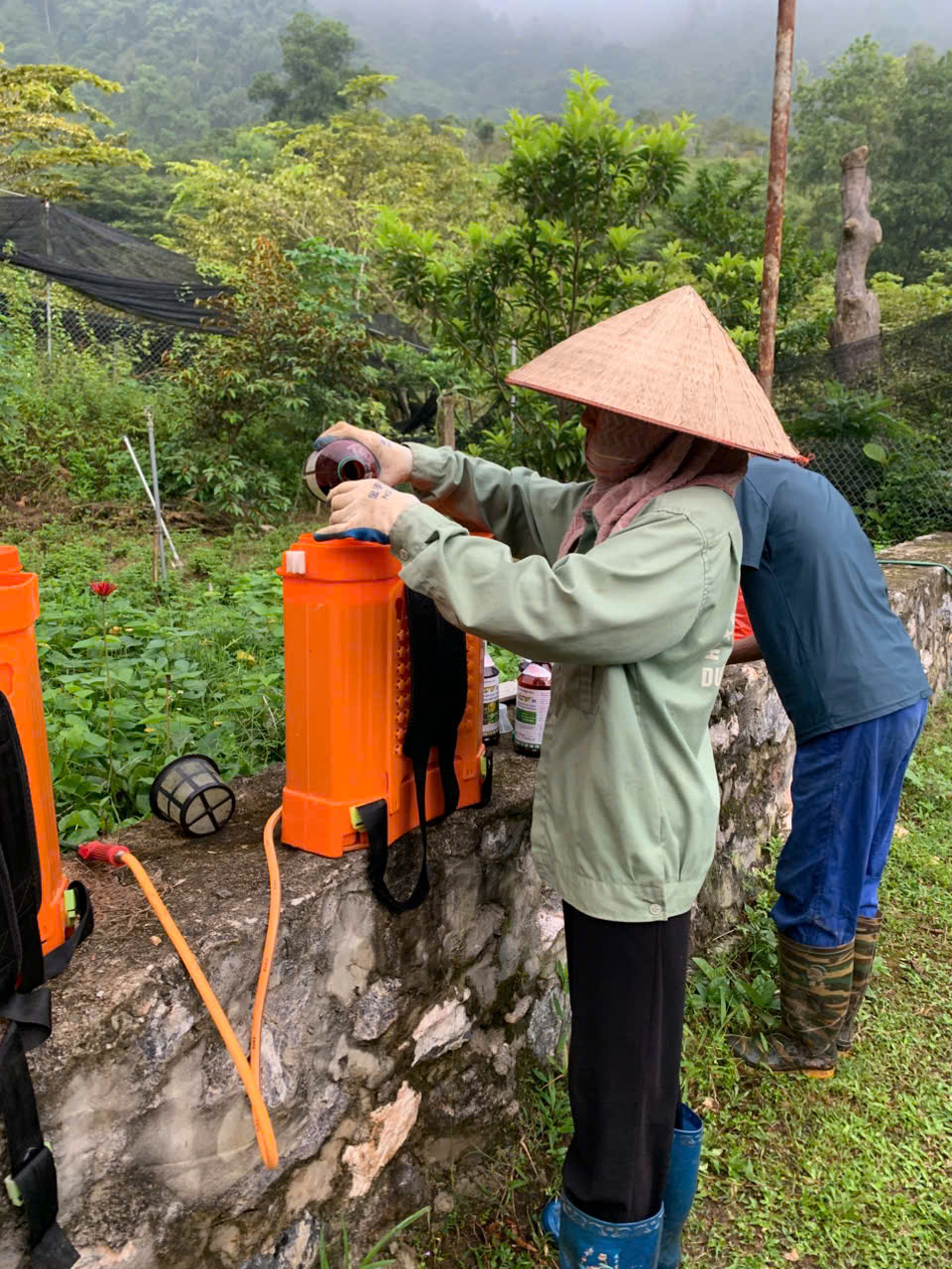 09-12-2024 12:12:00 | Bảo vệ thực vật | Tiến hành phun chế phẩm sinh học Anisaf 01, 02 và 03 để phòng trừ các loại sâu hại, các bệnh về nấm và virus gây ra cho cây. Cách dùng: pha tỉ lệ 200ml mỗi loại chế phẩm /20 lít nước phun cho toàn bộ vườn | Hoàn thành | |