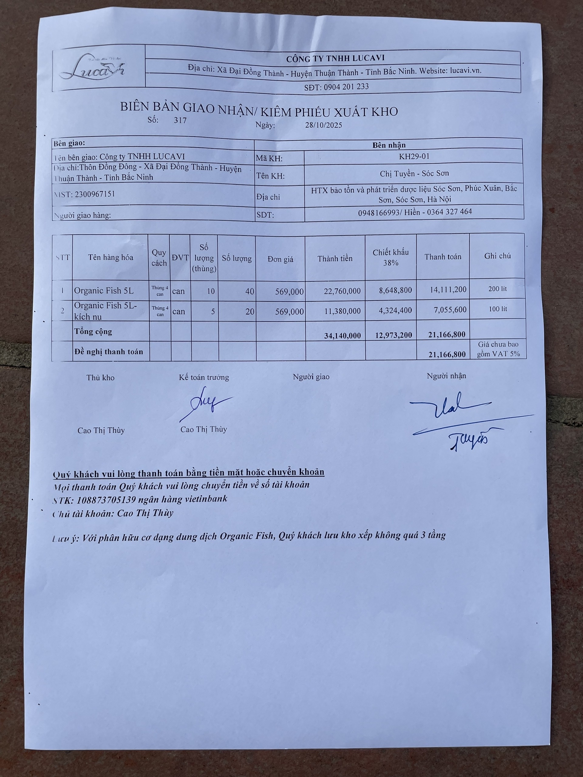 | 28-10-2025 12:10:00 | Phân hữu cơ | Nhập kho phân bón hữu cơ Lucavi. Khu 2 nhập kho 1 thùng phân Organic Fish (Thùng 4 chai 5L) tổng 20 Lít. Được bàn gioa từ khu 1. | Hoàn thành |