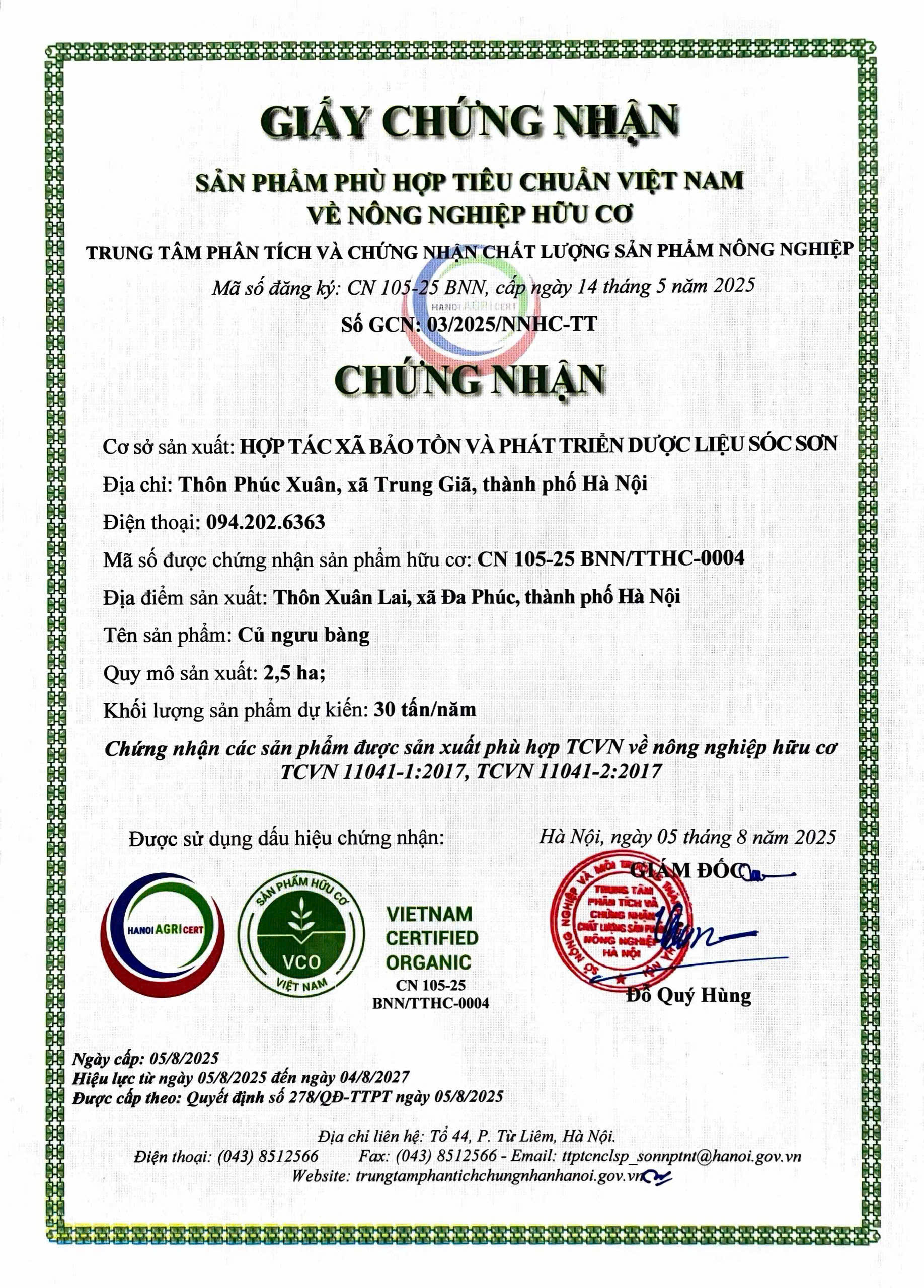 | 01-07-2025 12:07:00 | Vùng nguyên liệu | Vùng nguyên liệu đạt chứng nhận tiêu chuẩn Hữu cơ Việt Nam (TCVN). | Hoàn thành | |